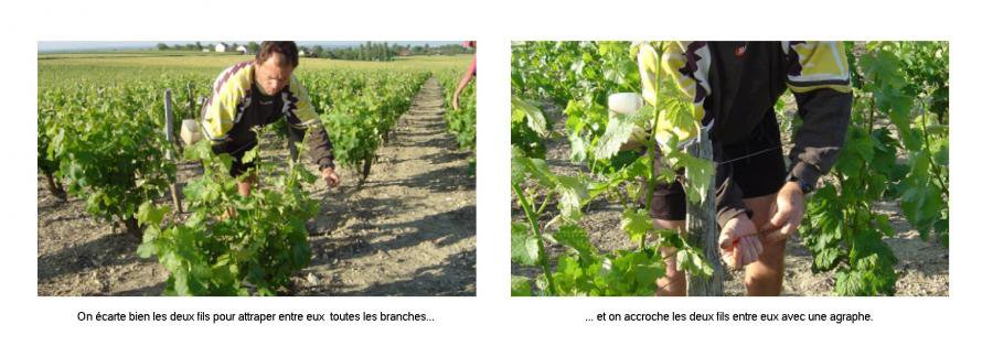 Les ébourgeonnages sont terminés ainsi que le relevage. Cela consiste à "relever" les fils de palissage et à insérer la végétation entre eux grace à de petites agraphes.