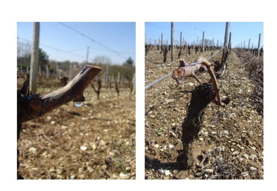 The spring comes and even if nights are still cool we live on very beautiful sunny days. It is the moment when the vine "cries". Nothing sad in it: the ground warms itself, the sap takes back its running ! And this life shows itself by these "tears" which pass by by the wounds of pruning.